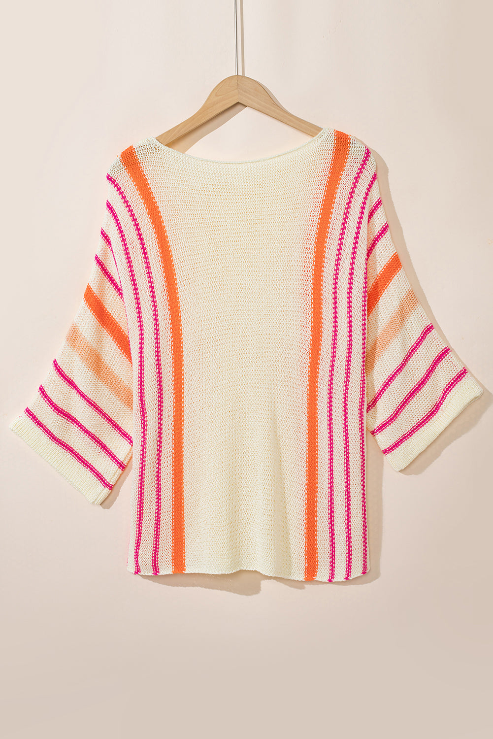 White Striped Detail Wide Sleeve Lightweight Knitted Sweater